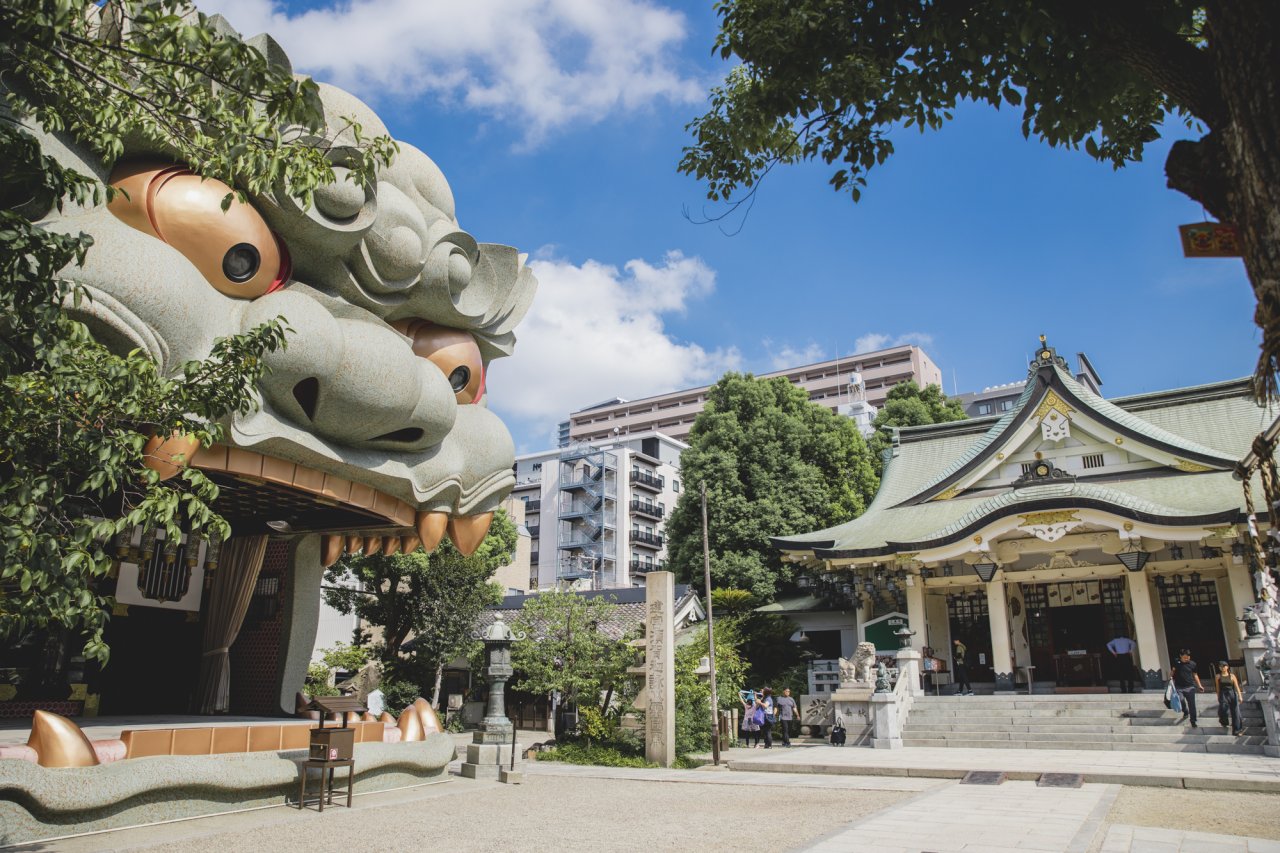 The enormous lion-head stage structure at this shrine is genuinely striking, built in 1974 as a performance space and now one of the more photographed spots in Osaka that most first-timers walk straight past. The grounds are calm and compact, so you can take it all in within 30 to 40 minutes and still feel like you actually paused rather than just snapped a photo. Free entry, cash donations optional.